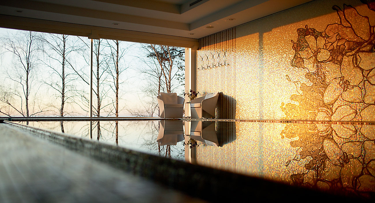 Luiziānas sindroms dažviet piemeklējis arī Teterevu villas interjerus. Dažviet paklāju lielo zīmējumu kontekstos iepretim aizloga ainavām. Vai, piemēram, baseina hallē, kur sienas rotā milzīgi ziedu tēlojumi Ravennas mozaīku atveidā. Bet līdzās stiklotā siena, aiz kuras paveras jūrmalas dabas cēlā un ne mazāk gleznainā bilde. Taču divu operdīvu partitūras palikušas nesaskaņotas. Uz skatuves nu viena mēģina pārkliegt otru. Un Visvarenais tik pasmīn. Ko nu jūs, mazie, te niekojaties?