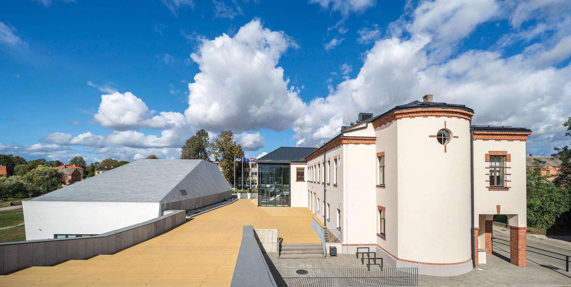 Mūzikas skolas jaunie apjomi ieaug ainavā kā apskaldīti laukakmeņi, to apdarei izmantots pelēks Igaunijas dolomīts - iespēja stāstam par vietējiem materiāliem ar Baltijas vai pat visu Ziemeļu identitāti. Zolitūdes traģisko notikumu kontekstā pasūtītājs, neraugoties uz inženieru aprēķiniem, izrādīja satraukumu par dabīgā akmens lielo svaru celtnes jumta daļā. Tika pieņemts kompromisa lēmums šajā daļā dolomītu aizstāt ar augstā izšķirtspējā apdrukātām HPL monolītā lamināta plātnēm, kaut arī ekonomiskais ieguldījums šādā risinājumā izrādījās vēl lielāks. Nav šaubu, paņēmiens ir strīdīgs, daļa profesionāļu imitāciju izmantošanu uztver kā adekvātu metodi, citi - kā pilnībā nepieņemamu. Tas, iespējams, projektam maksāja Latvijas arhitektūras Gada skates nomināciju.